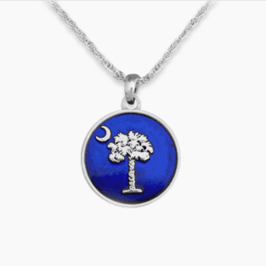 Show off your love for South Carolina by wearing this Campus Chic Palmetto Moon Necklace. This simple charm shows off the Palmetto tree and crescent moon that has become the symbol of South Carolina. This necklace features a simple iridescent charm with a blue background. The pendant hangs from an 18 inch cable chain necklace with a two inch extender so you can customize your perfect fit! What a beautiful South Carolina souvenir.