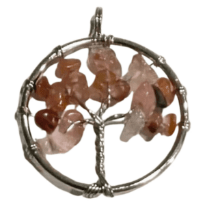 The Carnelian Tree of Life Pendant features vibrant red and white stones set in a circular design. Perfect for spiritual and nature lovers.